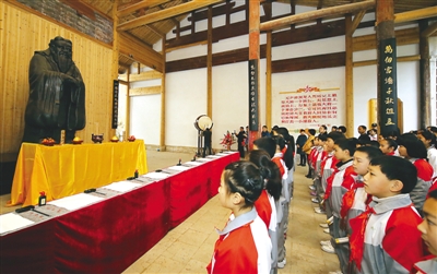 学生代表面对孔子塑像,准备吟诵《论语》经典名句 本报讯 “子曰:学而时习之,不亦说乎?有朋自远方来,不亦乐乎?人不知而不愠,不亦君子乎?”22日,朗朗书声从武夷山市文庙内传出。 当日,武夷山市学子教师、社会贤达齐聚文庙,举行一场简单而庄重的敬师礼仪式,以此激励全市中小学生尊师重教、勤学奋进,引导广大教育工作者为人师表、以德树人。这也是武夷山市首次在修缮好的文庙内举行敬师礼。 现场,近百名中小学生遵循古法,向孔子像敬献花篮,并吟诵《论语》经典名句。在开笔仪式上,来自城区中小学的10位校长代表,向学生发放毛笔,并让同学代表在文案前书写“人”字,寓意人生聪明识字始,通过开笔写人字,树立远大理想,踏出精彩人生。 据了解,近年来,武夷山紧密结合培育和践行社会主义核心价值观,大力弘扬优秀传统文化,修缮了一批历史文化遗迹,常态举行“武夷书院”讲坛、讲理堂等活动,在中小学校推广敬师礼,全市上下形成了见贤思齐、崇德向善的浓厚氛围。2015年,武夷山市修缮完成文庙崇圣祠、明伦堂,迎请一尊孔子像永久入驻,并向广大市民开放。文庙也再次成为市民纪念先贤,传承文化的地方。 (顾文静/文 邱汝泉/摄) |