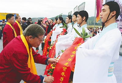 朱子后裔代表向朱熹塑像敬献花篮。 (罗光耀 摄) 本报讯 “君之所贵者,仁也。臣之所贵者,忠也……”伴随着《朱子家训》朗朗的诵读声,15日,世界朱氏后裔纪念朱熹诞辰885周年祭祀活动在武夷山市五夫镇朱子文化广场举行。来自世界各地及中国大陆、台湾地区的400多名朱氏后裔参加祭祀活动。 公元1130年,朱熹诞生,至今年整好885周年。朱子在闽北生活近60年,朱子理学在这里萌芽、成熟,并且得到传播,使得武夷山成为朱子理学的摇篮。 祭祀活动在新落成的5米高朱子雕像前举行。闽北朱氏后裔联谊会副会长、朱熹28代嫡孙朱锡勇宣读了祭文。现场的400多名朱氏后裔集体向朱熹雕像行三鞠躬礼。 参加祭祀活动的朱熹第30代裔孙、世界朱氏联合会名誉会长朱茂男告诉记者,朱子文化在海内外广泛传播,特别是对东南亚国家及台湾地区的影响较大,五夫镇是朱熹长期生活学习的地方,在朱子理学摇篮五夫祭奠朱熹,有利于凝聚世界朱氏的情感。“朱子文化能够成为两岸文化连接的基础,两岸的朱子后裔心连心,在‘一带一路’建设中,朱子文化也能发挥它的作用。”朱茂男说道。 (邱冬勇) |