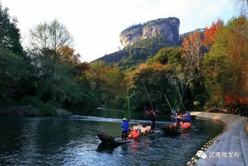 九曲溪自武夷山国家自然保护区的黄岗山发源,全长62.8公里,流淌到星村镇时进入风景区。九曲溪景区全程9.5公里,起于星村竹筏码头,止于一曲溪畔的武夷宫,乘竹筏顺水游览,约1.5-2小时,逆程筏游则须加倍。九曲溪上的竹筏工,撑筏掌舵的同时,也扮演着导游的角色,每日数趟往返于九曲清溪之上,载着游人移舟换景,向游人讲解一溪贯群山,清浅萦九曲的两岸风光和数不尽的传说故事。