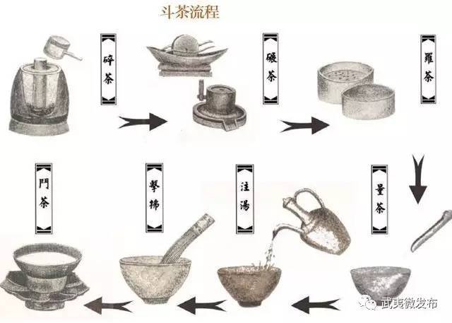 苏轼 咏茶 武夷溪边粟粒芽, 前丁后蔡相宠加。 争新买宠各出意, 今年斗品充贡茶。 吾君所乏岂此物, 致养口体何陋耶? 洛阳相君忠孝家, 可怜亦进姚黄花。 《咏茶》中提到的前丁后蔡指的是丁谓和蔡襄。苏轼把举朝上下斗茶成风,嗜茶如醉的陋习喻之为唐朝举国上下掀起的赏玩牡丹(姚黄花)的狂热。 宋代茶道高手不乏文人,在蔡襄、黄庭坚、苏轼兄弟、陆游等人的诗文中都能看到他们爱茶、嗜茶、品茶评水的功力。 在建州武夷山,宋人品茶的一大特色是以声辨水,口小不容易观察,只能依靠听觉,根据水的沸声来辨别候汤。因此蔡襄说“候汤最难”。 建州武夷山宋代的点茶法是把团茶碾成粉,再将沸水注入茶盏,将茶粉打成沫来喝。因为打出的茶沫是白色的,所以“茶色贵白”,以茶汤“白沫重叠,积聚水面,状如积雪”,着盏无水痕而又能耐久为佳。因之,衬托茶色之白的黑釉茶盏得到了最为充分的发展,其中产于建州的建盏最为有名。 |