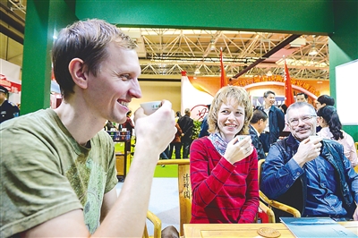 每届茶博会都少不了外国人的身影。“老外”到茶博会不仅仅是为了喝茶,他们也从中了解学习中国的茶文化。15日,在茶博会现场,这些“老外”对任何新鲜事物都表现出浓厚的兴趣,喝茶、购物、拍照……他们也成为茶博会上的另一种风景。(朱宇 卢国华 摄)
