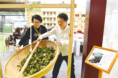 茶博会上,一些制茶工序流程的体验项目让游客兴致满满。图为游客现场体验摇青工序。(卢国华 朱宇 摄)