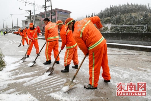 东南网讯(通讯员 邱汝泉)1月28日,福建武夷山公路分局养路工人在303省道汾水关路段破冰铲雪。当日,303省道福建武夷山境 内汾水关路段3个多公里的路面出现结冰情况,早上七点半左右,该路段车辆无法正常通行,受阻车辆 达到20多辆。武夷山交警、公路分局在接到险情报告后,立即启动应急预案,交警靠前疏导交通,公 路分局组织35人的抢险队伍、6台养护车辆 、1辆铲雪车、1辆撒盐机、10吨融雪剂赶赴现场,经过近 三小时的努力,道路于十点半抢通。