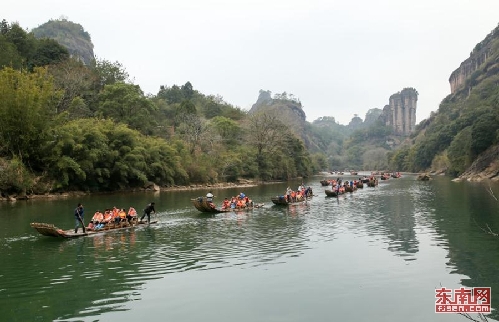 东南网讯(通讯员 邱汝泉)2月18日,游人乘竹筏在世界文化与自然双遗产地武夷山九曲溪漂流。当日,武夷山迎来春节旅游高峰,各个景点出现游人如织的热闹场面,被誉为中国最美的溪流九曲溪上千筏竞发。据旅游部门介绍,仅武夷山主景区中外游客就达50000多人次。