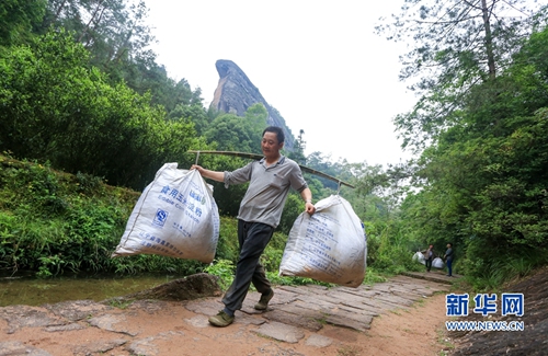一名挑着上百斤茶青的工人,在山道上费力行走(4月28日摄)。新华网 肖和勇 摄