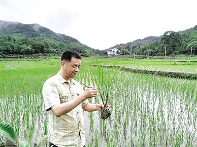 连日来,武夷山市开展水稻插秧巡查指导工作,多位农艺师深入田间地头现场指导农民插秧作业,并讲解水稻田间管理、病虫害防治等方面的知识。图为高级农艺师在检查插秧质量。(叶元高 摄)