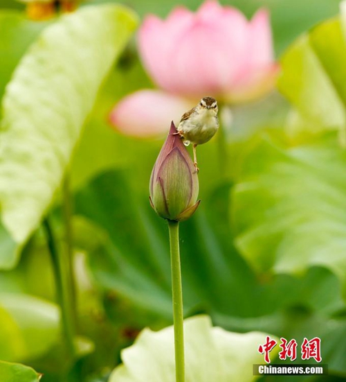 每天清晨,数种鸟儿来到荷塘嬉戏。 邱汝泉摄