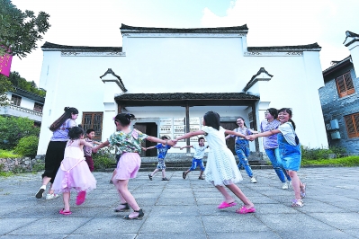 21日,在武夷山市洋庄乡革命老区基点村大安村,福建师大协和学院外语系10多名大学生志愿者为留守儿童开设的暑期“开心课堂”辅导班开班。图为课间休息时,志愿者与留守儿童在进行互动游戏。(记者 林辉 通讯员 林响 朱高航 摄)