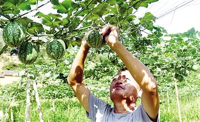 23日,武夷山市上梅乡底尾村村民丁振建在给吊瓜子修剪去枝。 丁振建在温州打工17年,今年回村创业,种植吊瓜子近百亩,依据目前的长势,每亩可实现产值8000多元。 (邱汝泉 摄)