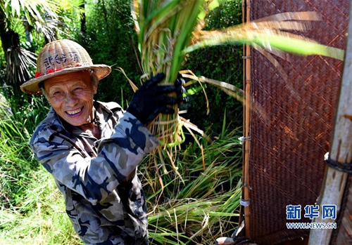 9月20日,武夷山市吴屯乡后源村村民在收割稻谷。新华社记者 张国俊 摄