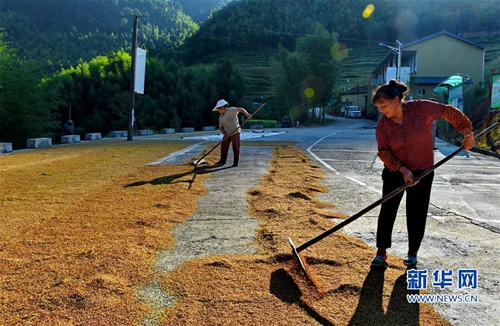 9月20日,武夷山市吴屯乡后源村村民在晒稻谷。新华社记者 张国俊 摄