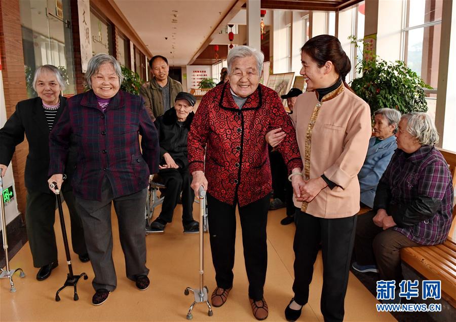 11月1日,陪护人员(右一)在武夷山社会福利中心陪老人散步。 新华社记者 张国俊 摄