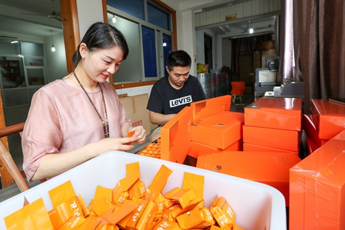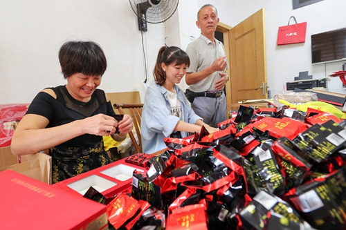 9月3日,武夷山市天心村茶农陈植贵雇佣的包茶工人正在包装武夷岩茶。