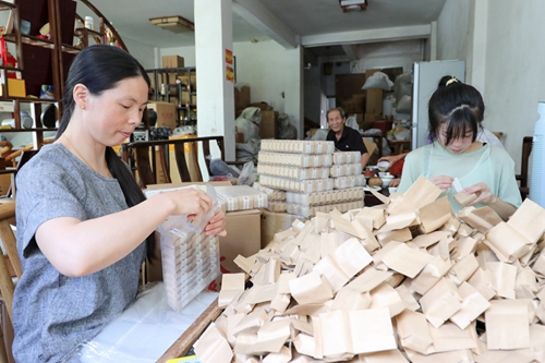 武夷山市天心村茶农陈植贵雇佣的包茶工人正在包装武夷岩茶 邱汝泉/摄