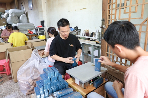 武夷山市天心村茶农吴煊海雇佣的包茶工人正在包装武夷岩茶 邱汝泉/摄