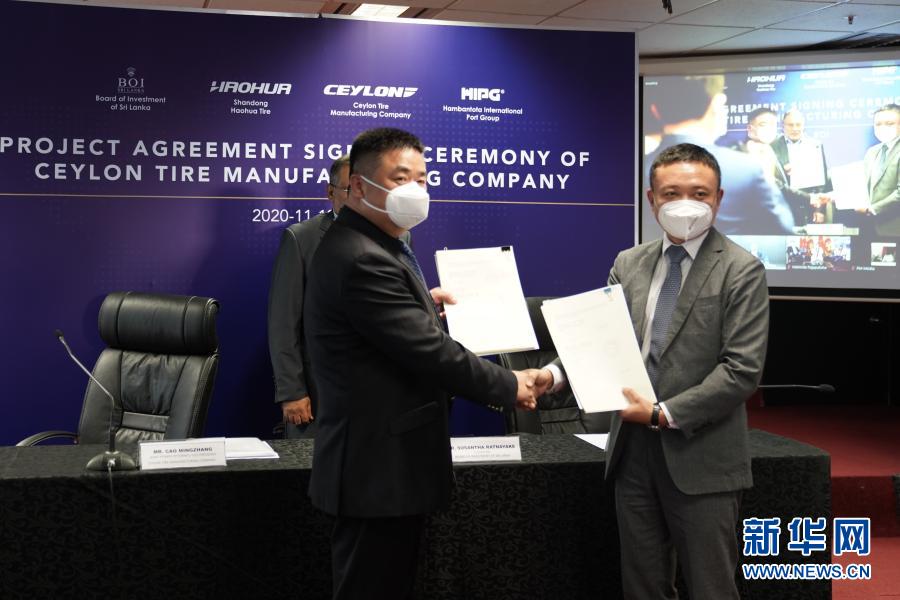 11月19日,在斯里兰卡科伦坡,来自中斯合营的汉班托塔国际港口集团(汉港)和山东昊华轮胎有限公司的代表展示签约文本。