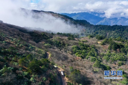 12月1日,科考人员乘车前往武夷山国家公园黄岗山原始地带考察(无人机照片)。新华社记者 姜克红 摄