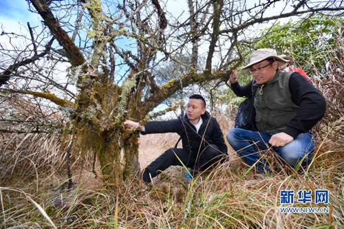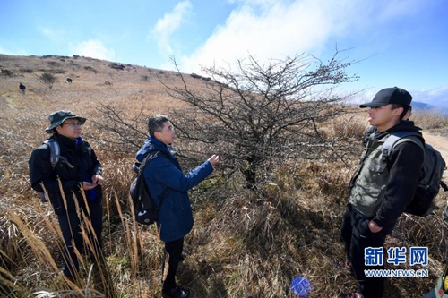 12月1日,来自北京大学的生态学硕士姚刚(左)与武夷山国家公园工作人员考察黄岗山植被。新华社记者 姜克红 摄