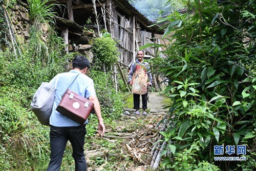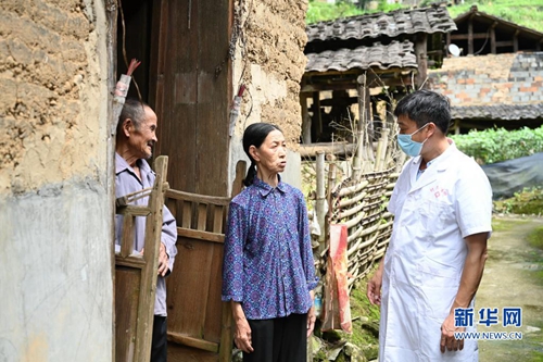 8月18日,杨家福(右)在武夷山市上梅乡厅下村纱帽畲小组看望患者章桂娥(中)。新华社记者 林善传 摄