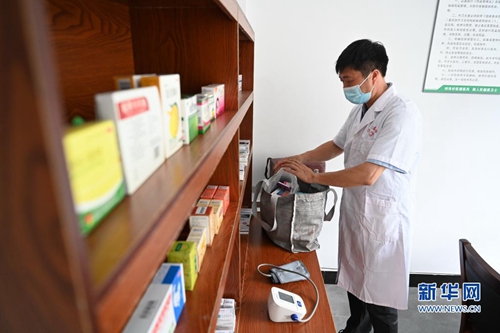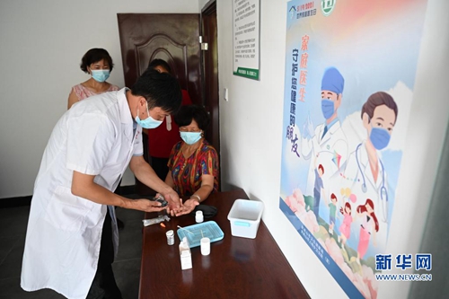 8月18日,杨家福在武夷山市上梅乡厅下村一体化卫生所为村民唐凤琴测血糖。新华社记者 林善传 摄