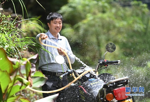 8月18日,杨家福在家门口清洗摩托车。新华社记者 林善传 摄