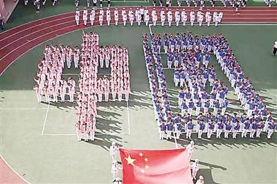 10月11日,武夷山市实验小学师生举行升国旗仪式。当日,武夷山市实验小学以少先队建队72周年为契机,组织开展“童心向党,唱支山歌给党听”主题活动, 图为师生在升国旗仪式上站成“中国”队形。 (邱汝泉 杨兰 摄)
