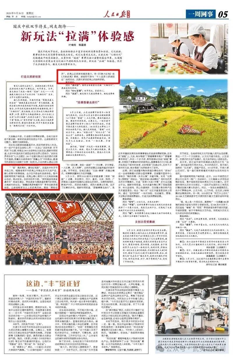 9月26日,《人民日报》关注武夷山国庆中秋推出系列文旅产品、暖心政策与保障措施,刊发文章《国庆中秋双节将至,网友期待——新玩法“拉满”体验感》,报道武夷山市精心策划十大文商旅体融合活动,全方位升级金秋旅游体验。 ▲《人民日报》截图 全文转载如下: 浙江省金华市婺城区百荷寻味创意美食工作坊内,工作人员正忙着赶制手工文创月饼,供应中秋节日市场。 时补法摄(人民图片) 近日,安徽省黄山市黟县的西递古村落举办创意晒秋活动,打造文旅融合的新场景。图为游客在村中游玩。 施亚磊摄(人民图片) 9月19日,2025城市足球邀请赛在贵州省贵阳市奥体中心体育馆开赛。图为观众在现场加油。 新华社记者 杨文斌摄 国庆中秋双节临近,各地纷纷推出丰富多彩的新消费场景和活动,文化旅游、赛事经济和文创消费等领域亮点纷呈,吸引大量网友关注。从重庆的“火锅专列”到福建南平的茶旅融合,从贵阳的“城超”赛事到浙江诸暨的篮球市集,从国图文创馆的北京商业首店到浙江平湖的西瓜灯活动,新玩法“拉满”体验感,吸引了众多游客参与,激发文旅消费新活力。 打造文旅新场景 重庆人真的太会玩了,直接把地铁3号线变成移动的火锅产业博览会。双节将至,今年,重庆推出了别具一格的“宠粉”方式——一列满载火锅文化与产业活力的“火锅专列”发车,为节日消费升温预热。 据人民网报道,车厢内布满“鸳鸯是最大的妥协”“微辣是最后的底线”等火锅热梗,展现出重庆鲜活滚烫的城市性格。乘客们纷纷拍照留念,分享这段充满地域特色的通勤体验。除了“火锅专列”,国庆假期,近20家知名火锅品牌将城景、江景、园景与火锅盛宴融合,沿江打造1.2公里“江岸火锅宴”;白居寺大桥下,“重庆火锅天下宴”亮相,以“星际穿越”为主题,结合江城夜景与桥体空间,营造沉浸体验,同步开展美食直播与“麻辣风云说”行业对话。 文旅融合升级,打造假日消费新场景。各地文旅市场不断创新,新奇的旅游玩法层出不穷,让游客感受文化魅力,解锁文旅新体验。 沿红色主题游线路重温历史,到京郊感受怡人秋色,听一场户外音乐会放松心灵……北京以“京彩秋韵 双节同庆”为主题,将推出2400余场特色文旅活动。据新华网报道,北京中秋国庆彩灯游园会将在世界公园举办,“京彩世界奇妙夜”七大主题区、180个创意光影点打造沉浸式光影艺术盛宴。居庸关长城将举办“居庸山月”中秋晚会,邀请市民游客在长城脚下共赏一轮明月。大运河源头遗址公园将举办“白浮古韵·迎中秋”文艺演出。 “‘香’遇武夷秋,最怡红袍韵”,在国庆中秋双节来临之际,福建省南平市武夷山市推出系列文旅产品、暖心政策与保障措施,全方位升级金秋旅游体验。据中国新闻网客户端报道,武夷山精心策划十大文商旅体融合活动,亮点纷呈。在夜间经济方面,“崇阳溪音浪美食嘉年华”将音乐演出、特色美食与漫游道夜景巧妙串联,点亮城市夜生活;“微醺武夷茶啤嘉年华”带来创新茶酒体验,让游客畅享舌尖上的武夷风味。围绕“票根经济”,武夷山还深度挖掘其潜力,持《印象大红袍》或《月映武夷》票根,游客即可参与“千人品茶斗茶游园会”抽奖活动,沉浸式感受武夷山的独特茶韵。 网友评论: 网友“遥时影”:期待去体验重庆这趟“火锅专列”,愿旅途热烈美好。 网友“Hmc听雨”:双节同庆,家国同心。 网友“周周”:激发假日文旅消费潜力,掀起消费新热潮。 “跟着赛事去旅行” 9月13日晚,山东省淄博市体育中心体育场气氛热烈,2025年山东省齐鲁足球超级联赛(以下简称“鲁超”)正式开赛。赛场内激战正酣,赛场外同样热闹。比赛当天,一场非遗市集在淄博市体育中心西门广场同步启动。非遗市集设置六大特色展区,140余家企业带来上千种本地特色产品。据人民网报道,“鲁超”以足球为平台,融入“好客山东”“好运山东”“好品山东”品牌体系。淄博赛区推出特色旅游线路、非遗展示、特色产品展销等配套活动,深化多元业态融合,实现“一场比赛、多重效益”。 据介绍,“鲁超”不仅是一项体育赛事,更是山东文化、旅游、商业多元融合的载体,赛事将进一步推动足球运动普及,塑造山东文体旅融合发展的新名片。 “为一场比赛,奔赴一座城”“一日比赛,多日停留,一人比赛,多人消费”,这样的场景正在越来越多的城市上演。双节将至,各地正通过“文旅+赛事”的融合模式,将赛事流量转化为经济增量。 9月19日,贵阳2025城市足球邀请赛(简称“城超”)启幕,来自贵州、四川、重庆、北京、陕西、广西等地16座城市组建的以城命名的球队,如贵阳咖啡队、醉美泸州队、西安肉夹馍队、咸阳大秦勇士队等,迈开了比赛的步伐。据新华网报道,“跟着赛事去旅行”,是近年来蓬勃发展的体育赛事催生的旅游消费新现象。在本次“城超”上,文旅、商务等部门“跟着赛事来推介”“跟着赛事来取经”。早在一个多月前,贵阳就倡议发起“城超”赛事,并得到了参赛城市的积极响应。据赛事承办方介绍,最开始是各个城市的体育、足协等部门沟通合作,后来不少城市的文旅、商务等部门也积极参与了进来。 近期,浙江省诸暨市陶朱街道办事处依托“浙BA”这一全省规模最大的群众篮球赛事,在诸暨市篮球中心旁举办“陶你所需·朱市云集”共富市集,采用“长期性+周期性”相结