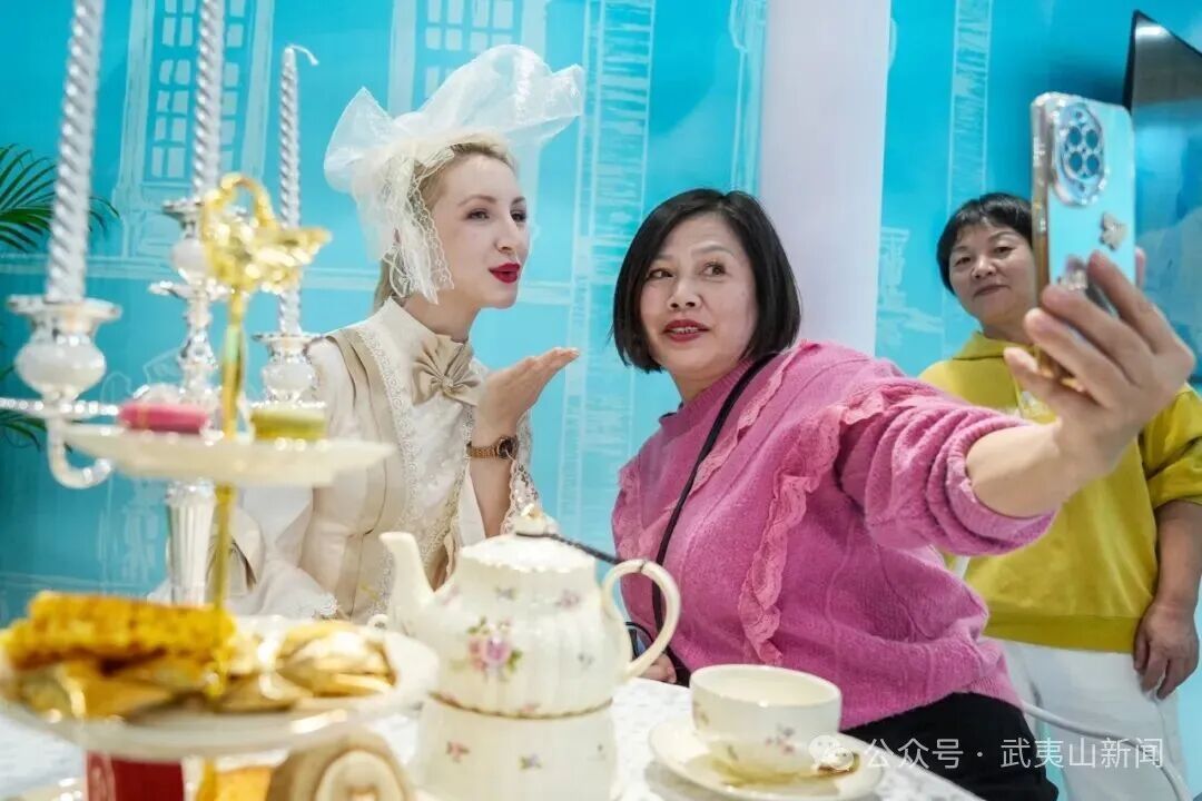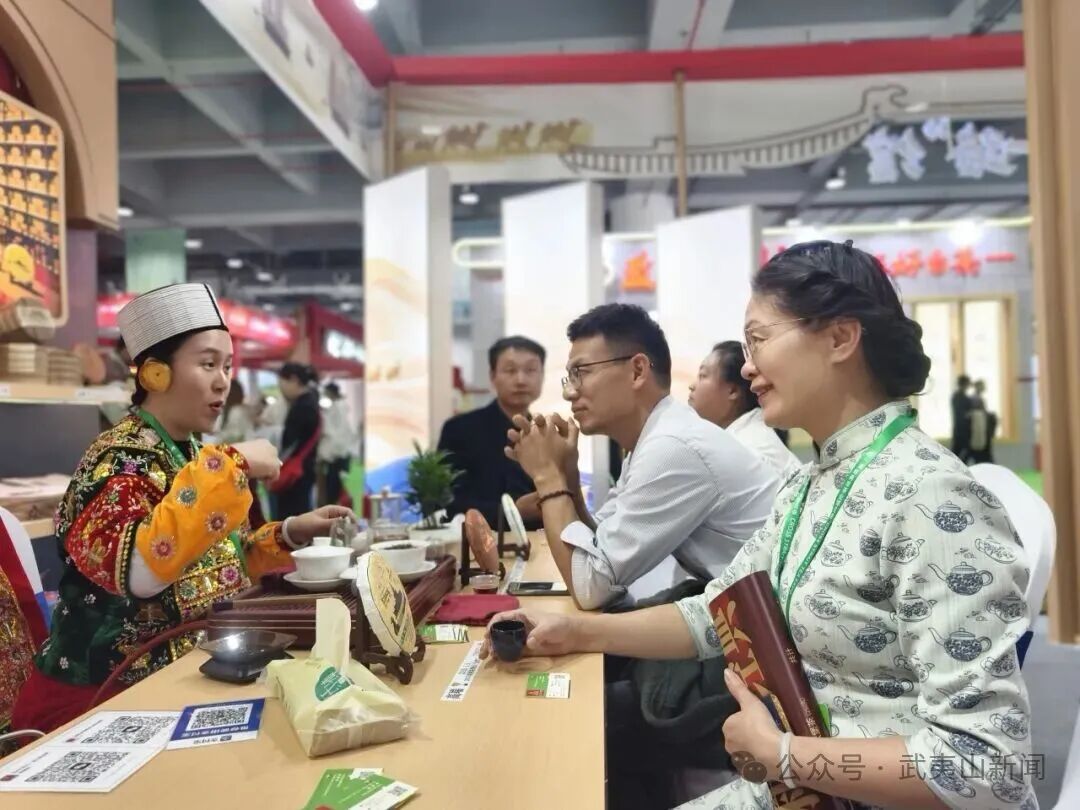 茶博会开幕当日,在“一带一路”馆内,来自世界各地的朋友因茶结缘。(朱宇 方诗琦 摄) 席上,一只素雅的青瓷盖碗居中,数只品茗杯如众星分散错落。茶席主人端坐,娴熟地进行着烫杯、投茶、醒茶、冲泡、分杯等一系列动作,行云流水,默然无声。众人围席品茗、交谈,因茶相遇,因真诚相知。这一席茶,沏开的是茶香,泡出的是情谊。 逛展、喫茶、互动……来自武夷学院的哈萨克斯坦籍留学生叶卡娜沉浸式体验茶博会上的精彩。“看,这只骆驼模型好可爱。”来到万里茶道馆,叶卡娜打卡了万里茶道节点城市的特色场景,了解跨域茶贸之路的历史知识,她大方地向记者展示了相机里记录的茶博新鲜事,“在这里,我喝到了好茶,尝到了美食,也交到了朋友。”叶卡娜说。 “这里的山水给我留下了很深的印象。”来自韩国的嘉宾李彩庆是第二次来到武夷山,首次参加海峡两岸茶业博览会。她说,自己一直对武夷岩茶及其文化抱有很浓厚的兴趣,希望借此次的机会,多走走看看,不仅细品“岩骨花香”,更以茶会友,结识更多心有同好的朋友。 链接“新机遇” 海峡两岸茶业博览会自2007年举办以来,始终以开放的姿态,以展促联,让茶博会不仅只是一场关于茶的“聚会”,而是链接全球伙伴的平台。 “这十多年来,我们曾到北京、上海、深圳、南宁等多个城市参加展会,但来武夷山还是第一次。对我们茶人来说,武夷山的‘大红袍母树’不只是一处风景,更是一种信仰,是心中一定要来朝圣的地方。”缅甸茶叶协会副会长段家席表示,借由参加海峡两岸茶业博览会的机会,他特意提前几天抵达,深入了解武夷山茶在种植生产、文化旅游等方面的产业业态。在他看来,每次参展都是一次宝贵的学习经历。武夷山在茶与文化、旅游等方面的融合都做得非常出色。他将会把武夷山当地推动茶文旅融合的做法带回去,也期待未来能与武夷山相关企业开展更多的合作。