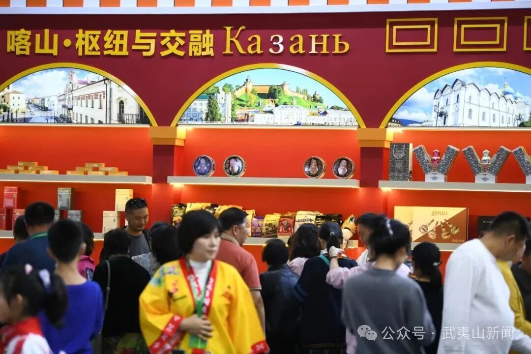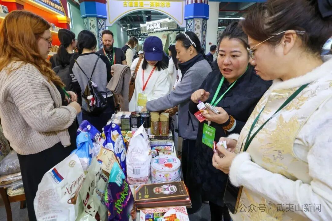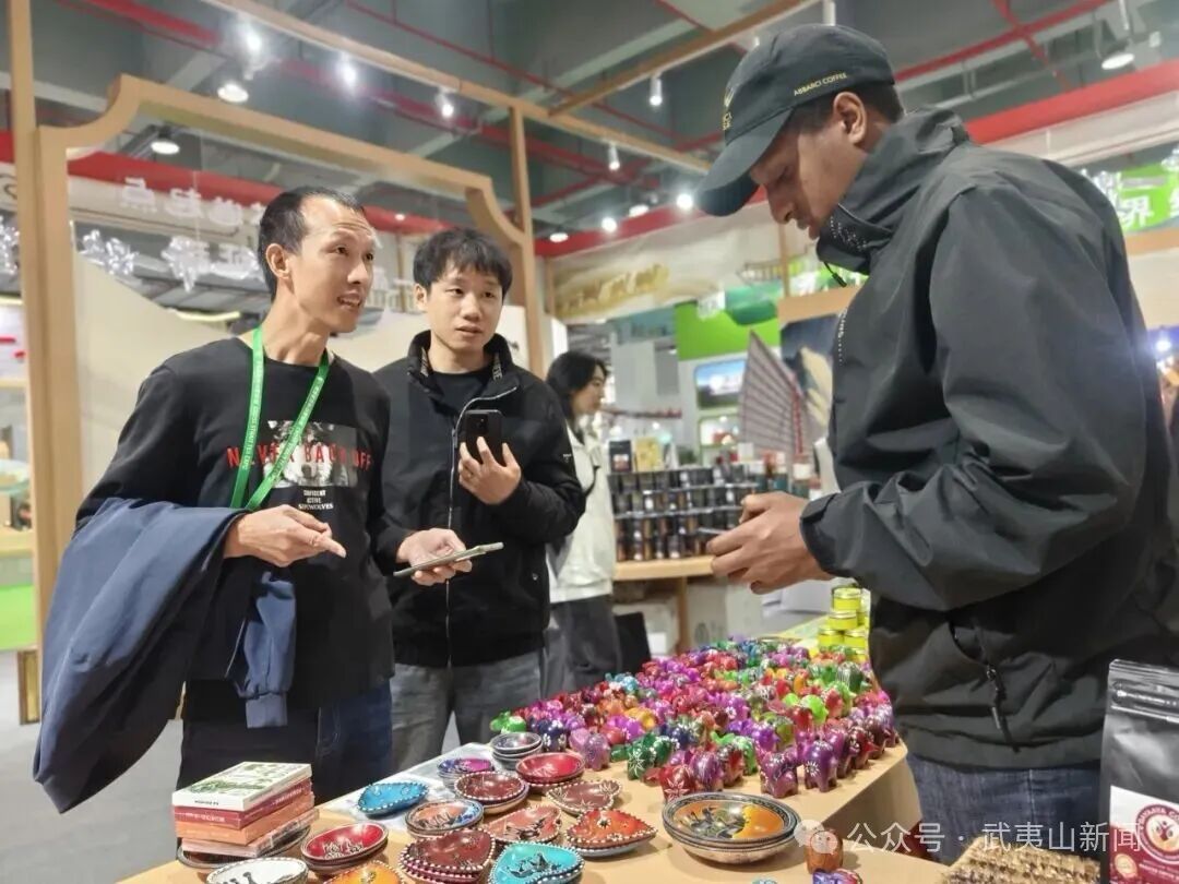 一带一路馆里,游客在选购来自乌干达的手工艺品。(郑金富 摄) 开启“新对话” 武夷山是世界红茶与乌龙茶发源地,也是万里茶道的起点,承载着深厚的茶文化与历史记忆。