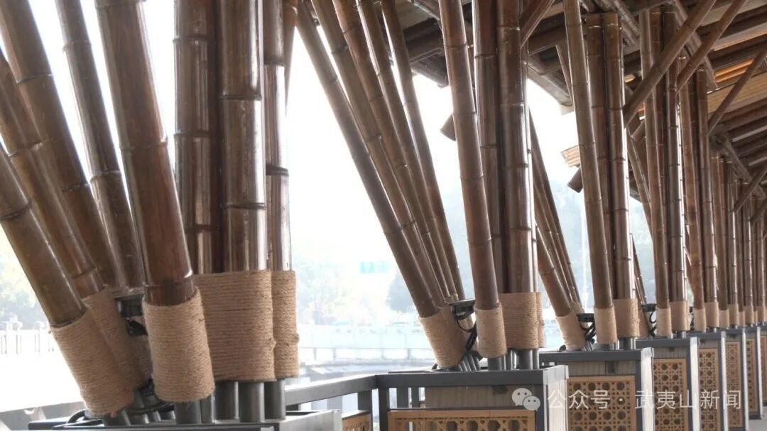 此次老桥改造是崇阳溪漫游道项目的关键节点。施工过程中,设计团队摒弃大拆大建的模式,选用3800多根生长周期达4年以上的毛竹,为桥体“披”上轻盈竹廊。值得一提的是,桥体竹材占比约90%,所用楠竹均经过高温碳化、阻燃等工艺处理,抗拉强度堪比普通钢材,耐久性可达20年以上,是“以竹代钢”绿色建材应用的创新实践。