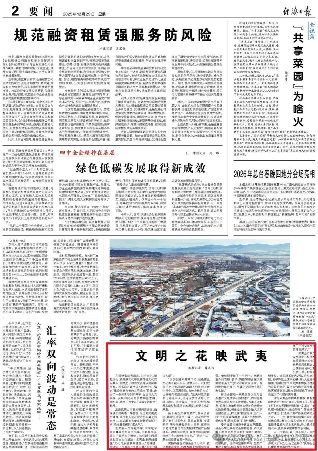 12月29日,经济日报刊发《文明之花映武夷》的文章,报道了2025年武夷山市获评全国文明城市。该市以人民为中心,活化朱子文化融入生活与产业,坚守生态保护底线,推广生态茶园模式,实现文化传承、绿色发展与民生改善的良性循环,成效显著。