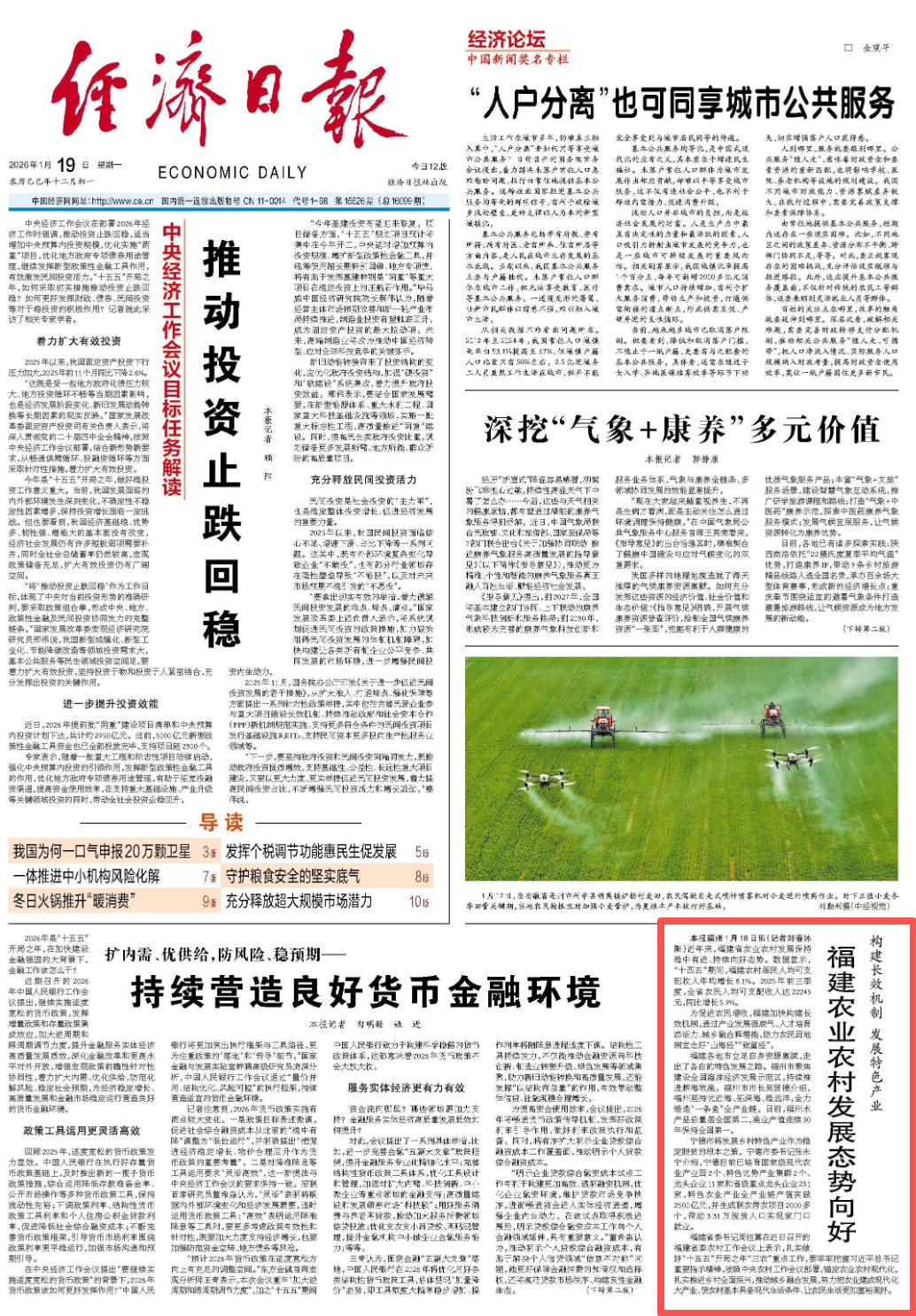 1月19日,《经济日报》头版刊发《福建农业农村发展态势向好》。详情如下——