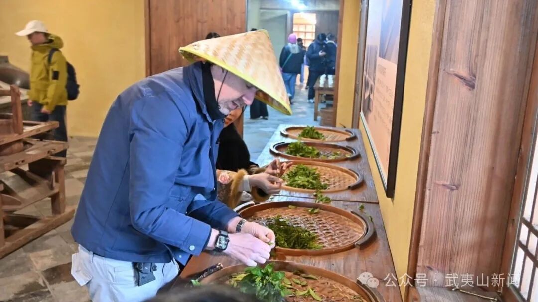 大V们沿武夷山国家公园1号风景道一路前行,首站抵达施嘉茗苑茶庄园。在茶农指导下,他们戴竹编帽、挎茶篓,认真学习采茶技巧,了解到“一芽三叶”是制作优质武夷岩茶的理想原料,亲手采摘下带着新鲜茶芽。随后,大家走进传统制茶作坊,沉浸式体验摇青、炒青、揉捻等手工制茶工序,近距离感受鲜叶到成茶的蜕变,领略武夷岩茶手工技艺的精妙。