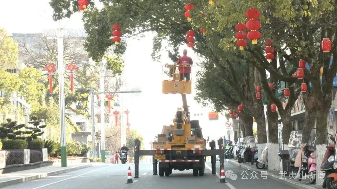 在布置现场,工人师傅们分工协作、有条不紊,登上高空作业车,在行道树上缠绕灯带、悬挂灯笼,喜庆的中国红与城市的光景相互映衬,浓浓的年味儿扑面而来,提前勾勒出一幅祥和喜庆的新春画卷。