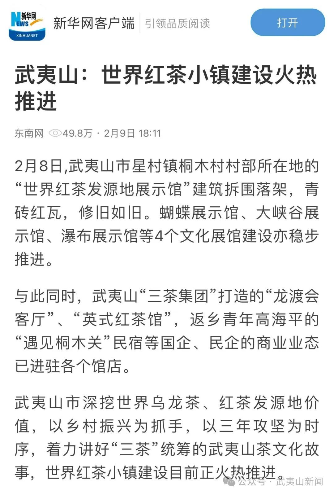 9日,新华网发表了《武夷山:世界红茶小镇建设火热推进》的文章。文章报道了武夷山桐木世界红茶发源地展示馆落架,多展馆建设推进,国企民企业态入驻。世界红茶小镇2023年10月启动,规划运营先行、三级专班统筹、村民广泛参与,改造民居风貌、完善文旅业态,带动村民增收,助力茶文化传承与乡村振兴。