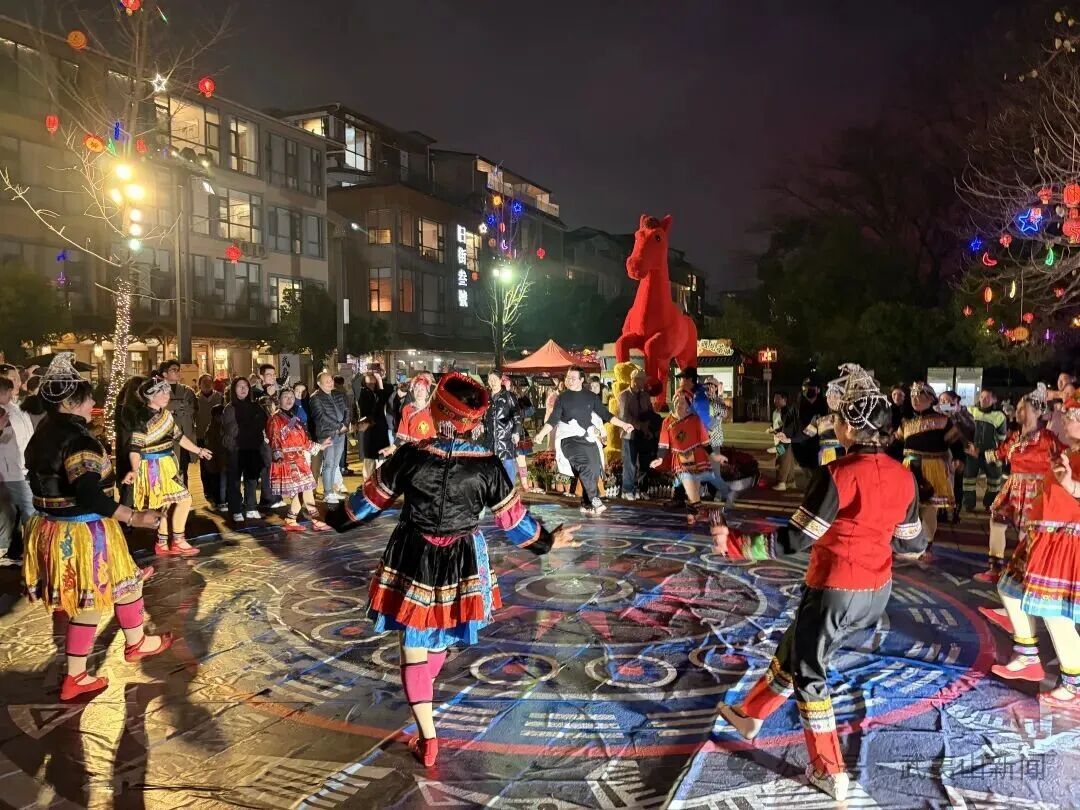 马年新春,兰汤桥畔灯影连绵,千树流光,年味漫溢。 21日晚,正月初五,春节的热闹氛围在朱子渡码头升腾,畲族风情迎新春活动热闹开演,一曲曲畲歌、一支支民俗舞蹈,把闽北新春的鲜活与热烈展现得淋漓尽致。