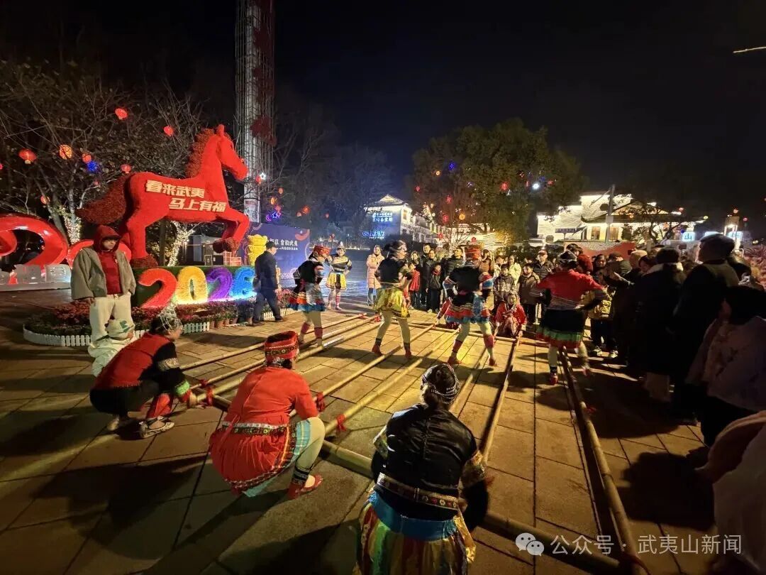“氛围很浓,特别有感染力,我们就是奔着武夷山的年味来的!” 来自江苏的费先生带着家人加入竹竿舞队伍,脸上笑意难掩。他们专程而来,沉浸式感受闽式福年的独特韵味。欢快的舞蹈跨越地域阻隔,成为无声的语言,让每一位来客都读懂武夷新春的真诚与鲜活。