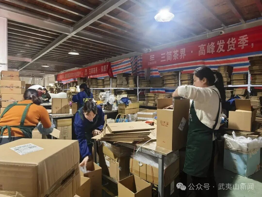 日前,位于武夷山经济开发区的三简茶界茶文化产业园内已是一派火热景象。仓储发货中心,打包声、分拣声此起彼伏,装车的车辆穿梭不停。