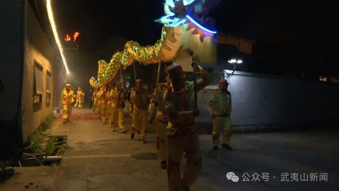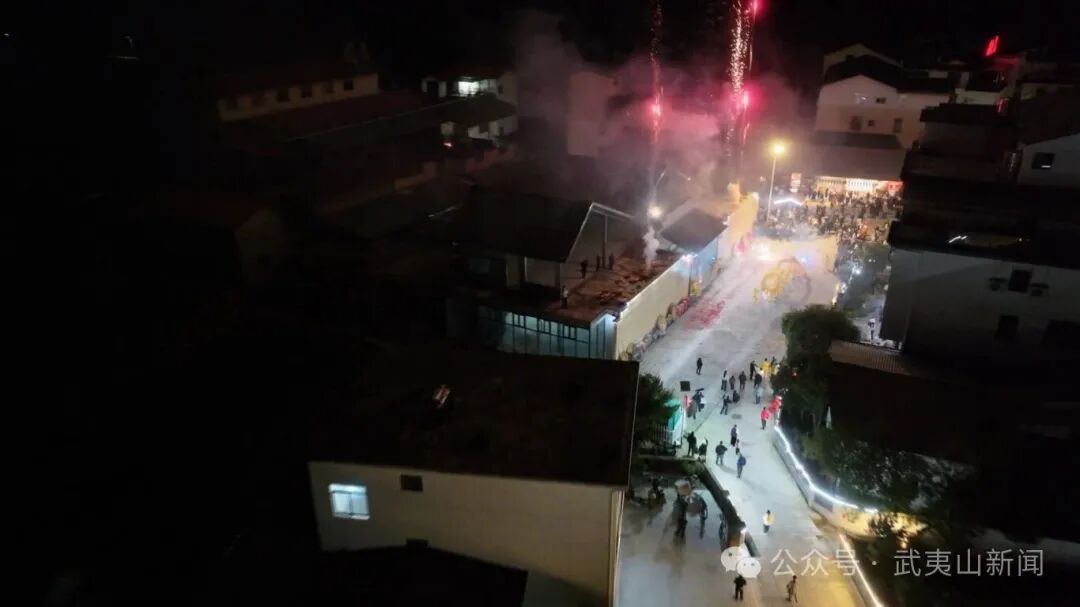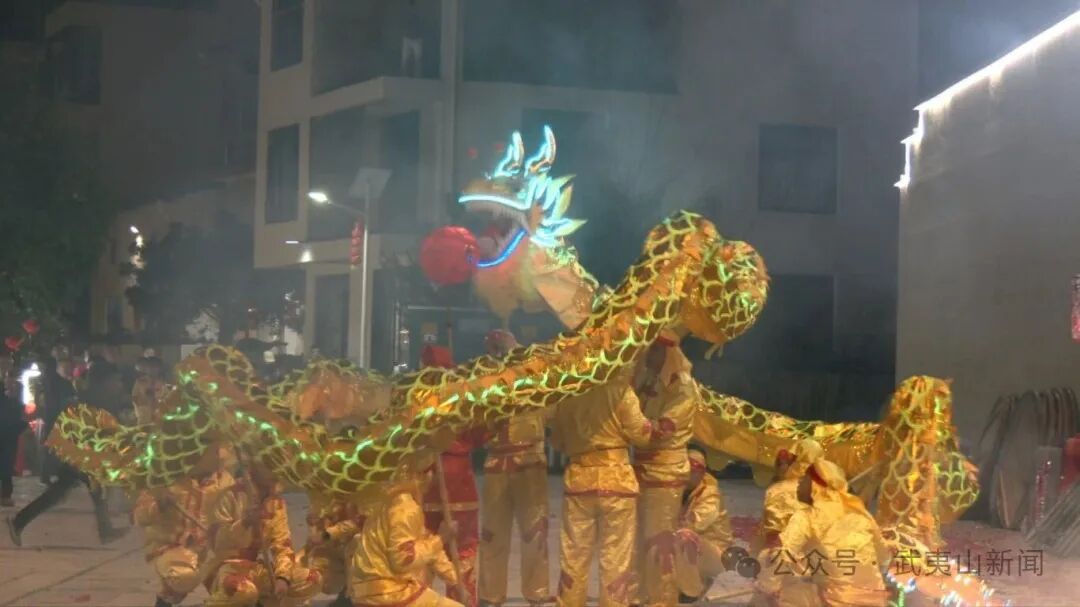 烟火绽山河,龙舞庆丰年。夜幕降临,璀璨烟火点亮夜空,铿锵锣鼓响彻村落,祥龙翻腾起舞,将整场活动推向高潮。金光闪闪的巨龙在村民们的舞动下腾空而起,时而盘旋飞舞,时而昂首挺立,引得现场观众阵阵喝彩,大家纷纷举起手机,记录下这难忘时刻。灵动的龙身与绚烂的烟花在夜空中交相辉映,传统民俗与浪漫夜色融为一体,绘就出黄村村元宵夜最动人的景象。