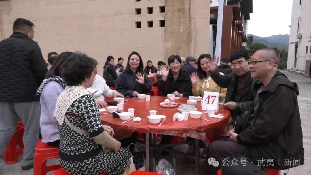 华灯初上,备受瞩目的千人村宴流水席正式开席,村民们端出熏鹅、千层糕、麻糍团等特色菜肴,游客与乡邻围桌而坐,共享团圆盛宴。席间不时举杯共庆,互道祝福,欢声笑语不断,浓浓的团圆氛围弥漫在整个村落。