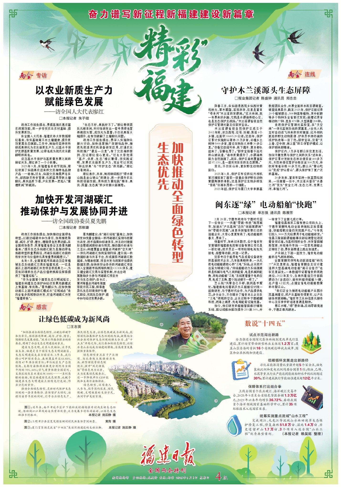 《福建日报》2026年3月8日第04版 生态优先,加快推动全面绿色转型 两会专访 以农业新质生产力赋能绿色发展——访全国人大代表廖红 政府工作报告提出,要提高强农惠农富农政策效能,进一步夯实农业农村基础、提升发展质效。在全国人大代表、福建农林大学教授廖红看来,夯实基础离不开土壤健康,提升质效更需生态赋能。工作中,她始终坚持将科研成果转化为农业新质生产力,以高水平保护支撑高质量发展,让绿色成为现代农业最鲜明的底色。详情>>> 加快开发河湖碳汇推动保护与发展协同并进——访全国政协委员夏先鹏 政府工作报告提出,加快推动全面绿色转型。以碳达峰碳中和为牵引,协同推进降碳、减污、扩绿、增长,增强绿色发展动能。在全国政协委员、民革福建省委会主委夏先鹏看来:“提升生态系统碳汇能力是推动绿色低碳转型的重要路径,河湖系统碳汇功能的科学开发与价值转化具有重要战略意义。”详情>>>