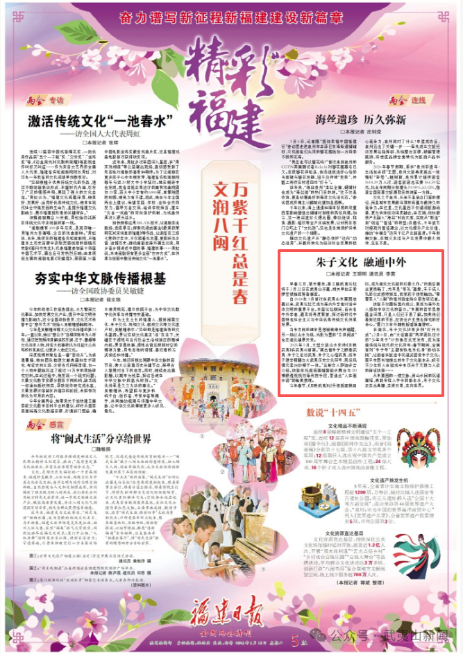 3月10日,福建日报发表文章《朱子文化 融通中外》,报道了第三届武夷论坛将于3月22日在武夷山开幕,相关单位正紧锣密鼓推进筹备事宜。