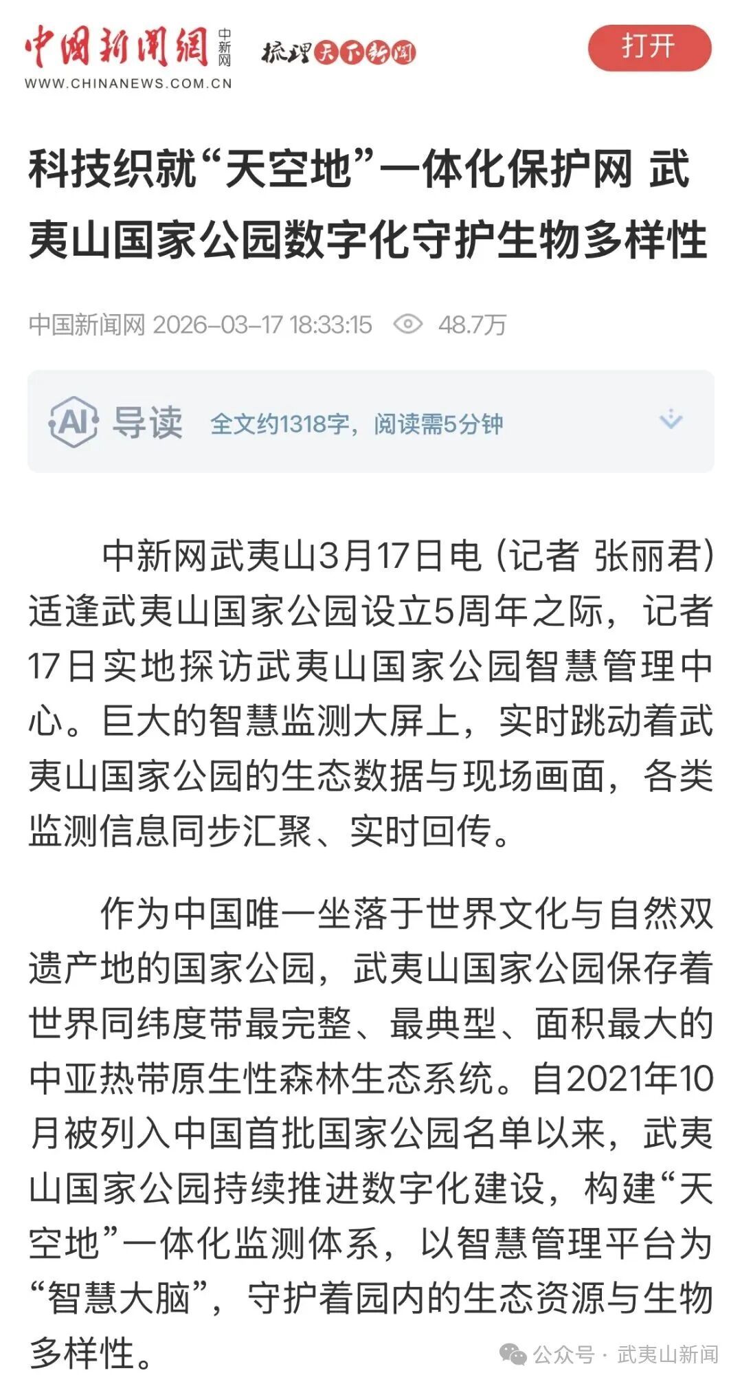 ▲中国新闻网截图 原文转载如下: 适逢武夷山国家公园设立5周年之际,记者17日实地探访武夷山国家公园智慧管理中心。巨大的智慧监测大屏上,实时跳动着武夷山国家公园的生态数据与现场画面,各类监测信息同步汇聚、实时回传。 作为中国唯一坐落于世界文化与自然双遗产地的国家公园,武夷山国家公园保存着世界同纬度带最完整、最典型、面积最大的中亚热带原生性森林生态系统。自2021年10月被列入中国首批国家公园名单以来,武夷山国家公园持续推进数字化建设,构建“天空地”一体化监测体系,以智慧管理平台为“智慧大脑”,守护着园内的生态资源与生物多样性。
