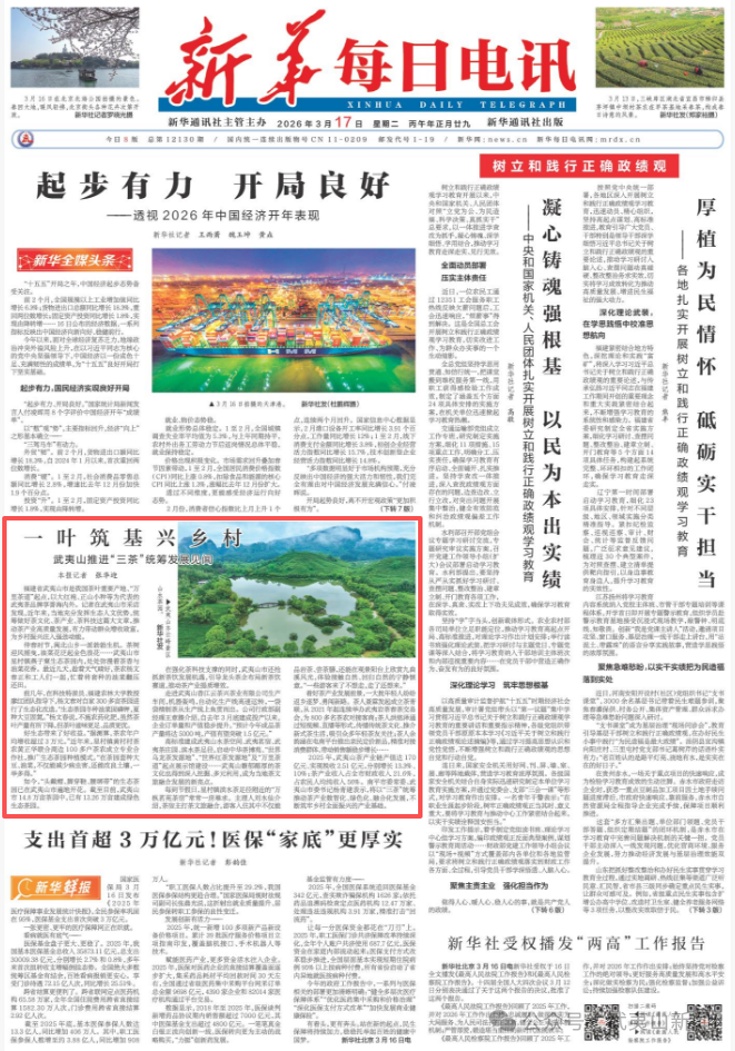 17日,《新华每日电讯》头版要闻刊载《一叶筑基兴乡村》,关注武夷山推进“三茶”统筹发展工作。