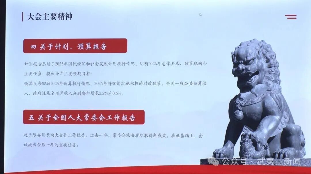 宣讲中,江元勋代表以“走进春光里,奋斗‘十五五’”为主题,结合参会履职经历,全面介绍大会概况,系统传达大会主要精神,深入学习习近平总书记重要讲话精神,解读政府工作报告、“十五五”规划纲要等核心内容。他详细介绍了福建代表团依法履职、务实建言、展现担当的有关情况和基层代表立足茶产业发展、乡村振兴、生态保护等领域传递民意、共商国是的履职实践,让与会人员对全国两会精神有了更直观、更深刻的理解。大家认真聆听,表示将以此次宣讲为契机,把学习贯彻大会精神与人大工作紧密结合,以更饱满的热情投身“十五五”开局之年各项工作。